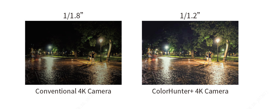 Cuando ColorHunter se une a la resolución 4K Ultra HD, las cámaras pueden capturar imágenes vibrantes y coloridas en cada detalle. El sensor de gran tamaño de 1/1.2" en 4K Ultra HD proporciona imágenes nítidas y llenas de color incluso cuando los LEDs cálidos suplementarios están apagados.