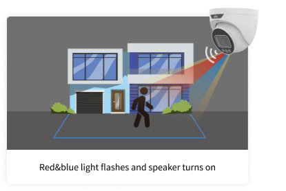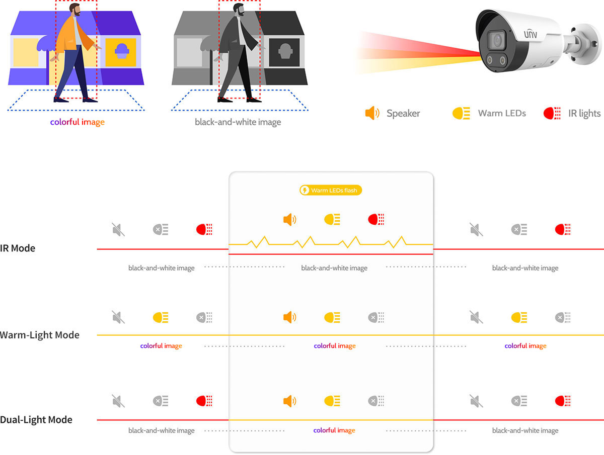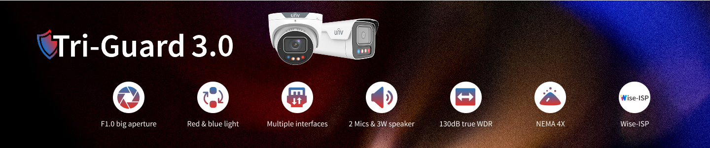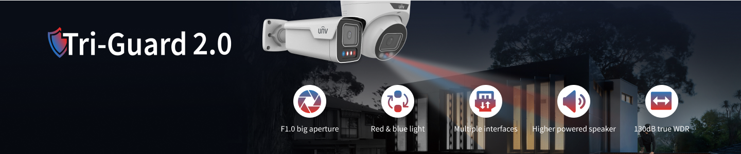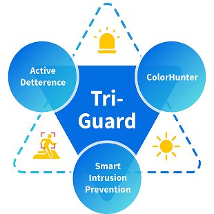 A tecnologia UNV Tri-Guard combina Prevenção Inteligente de Intrusão (SIP), ColorHunter e Dissuasão Ativa para prevenir crimes à noite. Ela não apenas emite alertas durante eventos, mas também captura detalhes de cores em ambientes com pouca iluminação.