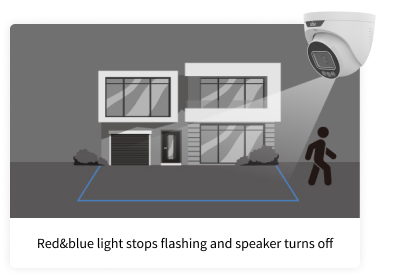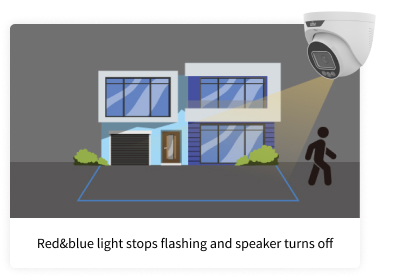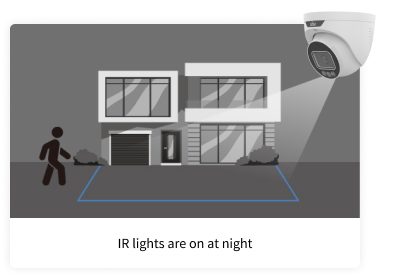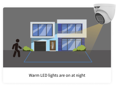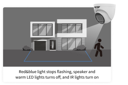 As luzes permanecem apagadas, proporcionando melhor ocultação para a câmera. Quando um estranho entra, as luzes acendem, permitindo que a câmera capture mais detalhes. Tanto a Dissuasão Ativa quanto o ColorHunter são ativados simultaneamente.