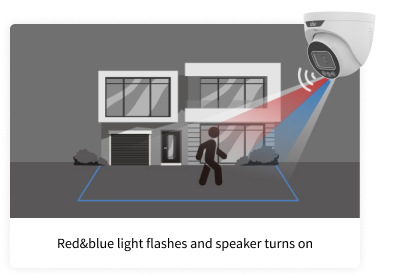 Independentemente da hora do dia, quando um intruso entra na área monitorada, o sistema dispara um alarme e ativa um holofote piscante para dissuadi-lo.