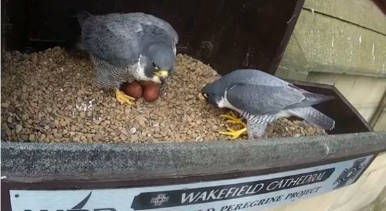 Фрэнсис Хикенботтом, участник проекта Wakefield Peregrine Project, сообщил, что яйца птиц должны вылупиться в конце апреля.