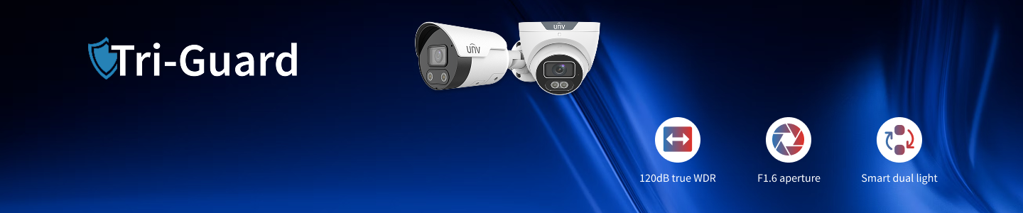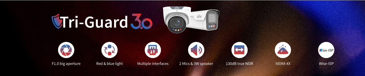 Технология UNV Tri-Guard объединяет Интеллектуальную систему предотвращения вторжений (SIP), ColorHunter и Активное предотвращение, чтобы предотвращать преступления ночью. Она не только оповещает во время событий, но и фиксирует цветные детали в условиях низкой освещённости.