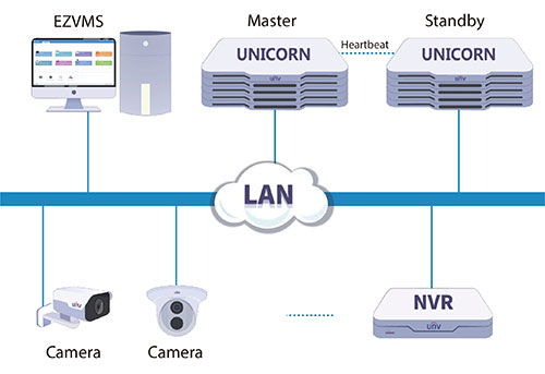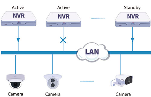 - UNV NVRs are deployed with N+1 hot backup capability. In the same networking system, if any active NVR is out of service, the Standby NVR will automatically take over.