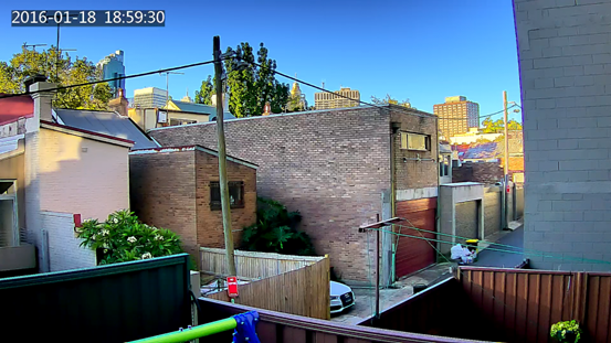 Motion blur is at good levels, the image stream is relatively clean at default settings – there’s a small amount of latency – around 350th of a second in my estimation. At 6.57pm it’s 2600 lux and the scene acuity is still improving. There’s a little rendering swim here and there and some signs of digital smoothing but overall quality is high. The image goes on improving for the next 15 minutes or so and once the sun is lost from the canyon of the lane, the image darkens a little but remains notably brighter when compared to other 1080p cameras in this application.